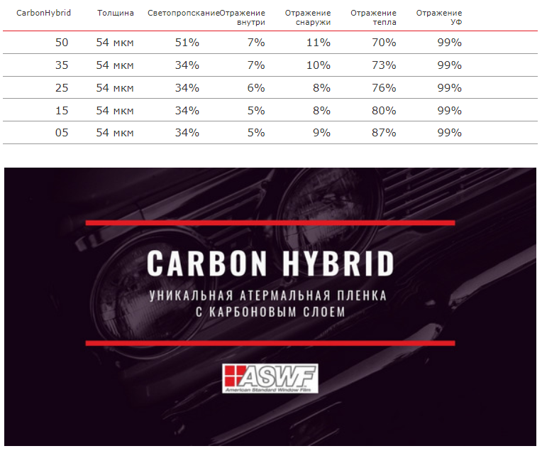Светопропускание этой линейки варьируется от 5 до 50 процентов. Carbon Hybrid легко формуется, обладает отличной прозрачностью и самое главное — отражает до 85 % инфракрасного излучения. Причем отсечение тепла для всех градаций светопропускания значительно превосходит показатели