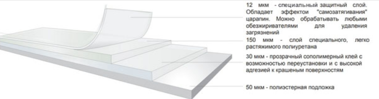 Общая толщина составляет 180 микрон, что обеспечивает надежную защиту ЛКП автомобиля.